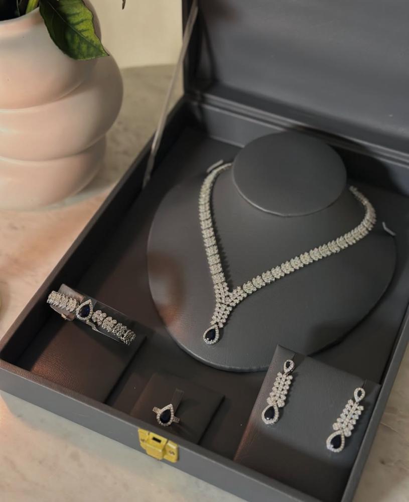 تميّزي بإطلالة أنيقة واستثنائية مع هذا الطقم المذهل الذي يجمع بين بريق الزركون ولمسة من الجمال الطبيعي بالأحجار الخضراء الفريدة. تصميم فاخر يجعل كل تفاصيله قطعة فنية تعكس الذوق الرفيع.