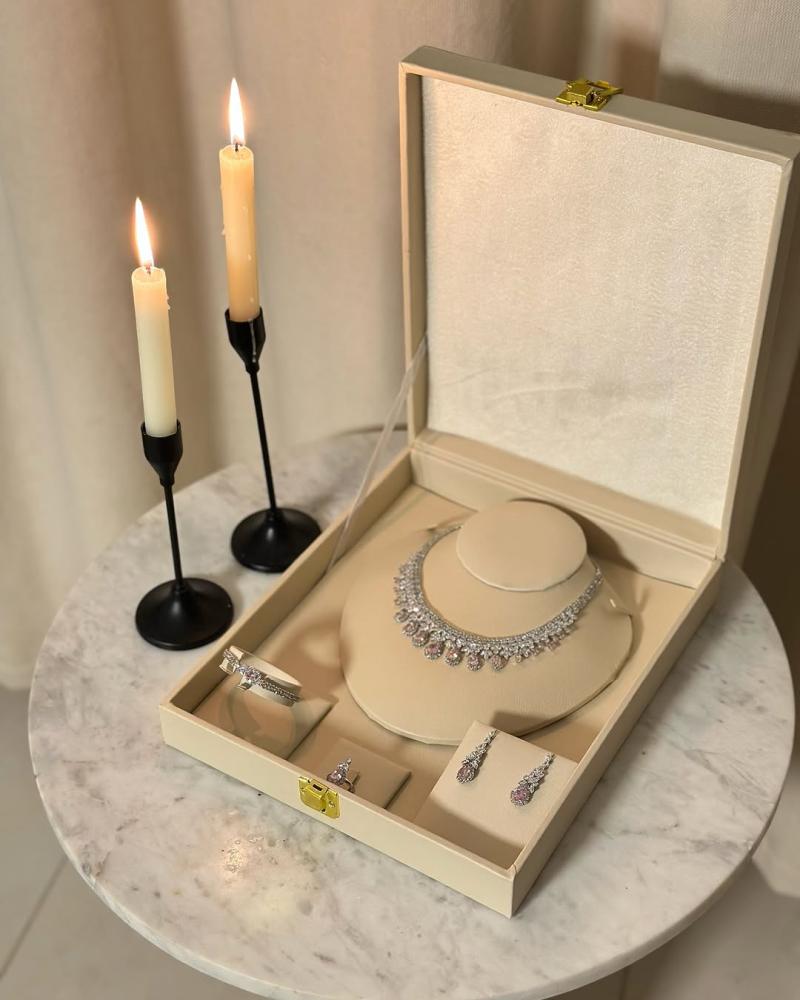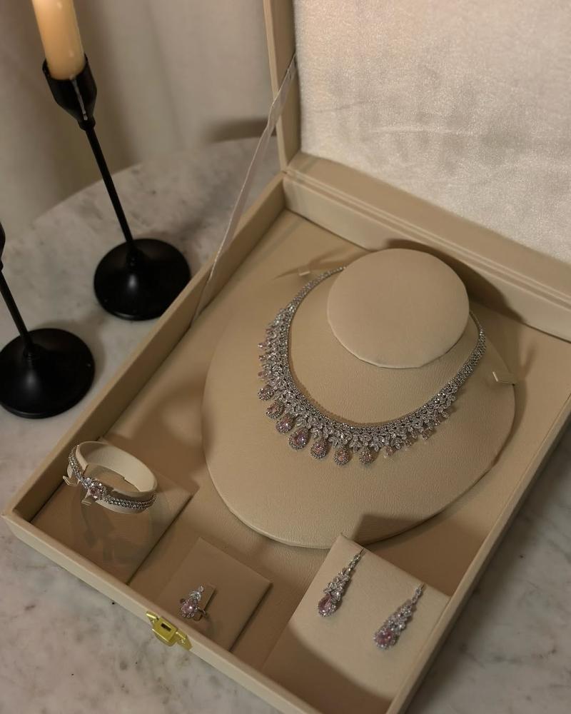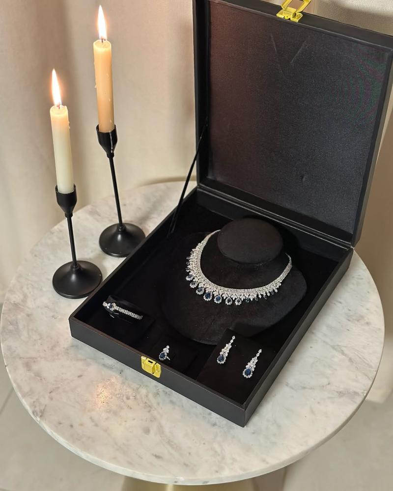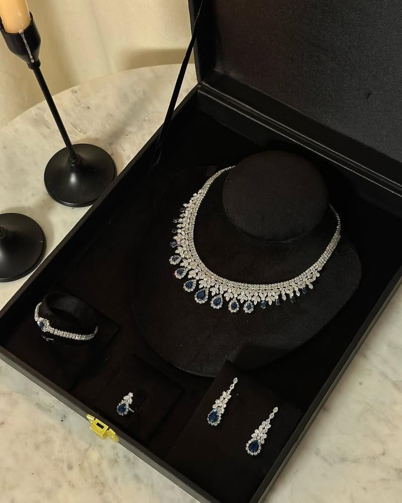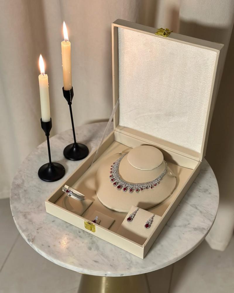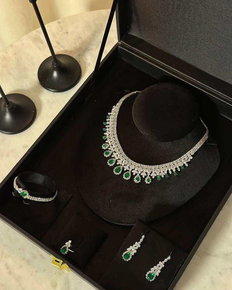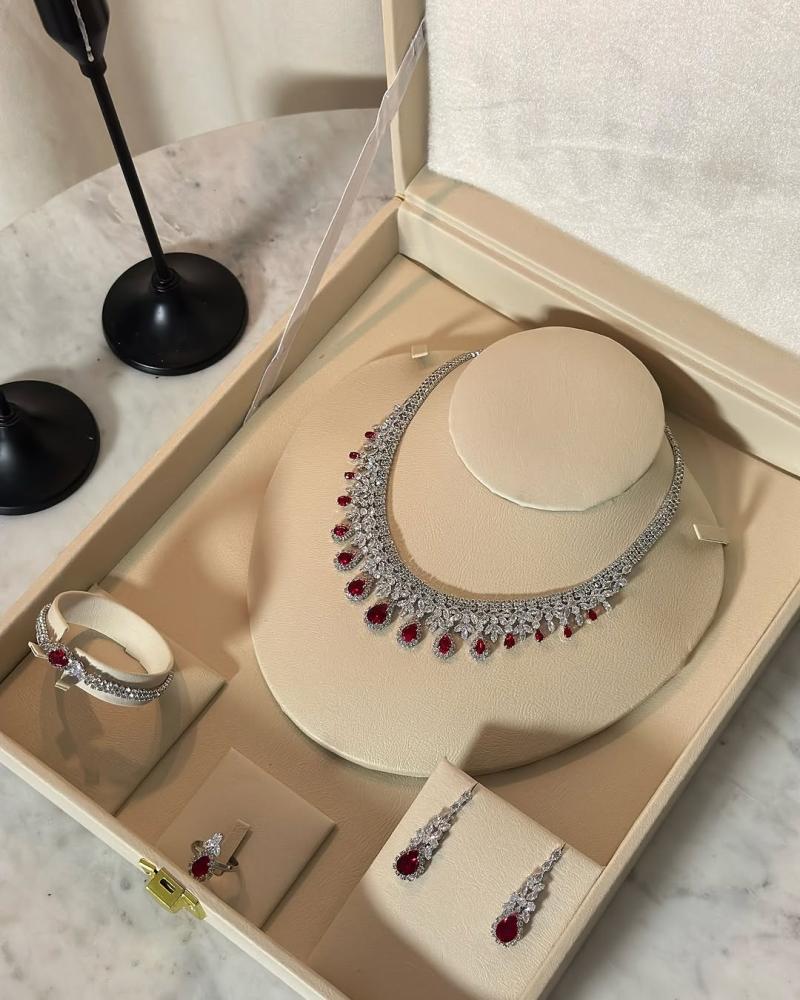 - المكونات: عقد فاخر مرصع بأحجار براقة، أقراط متدلية أنيقة، سوار عصري، وخاتم بتصميم مميز.