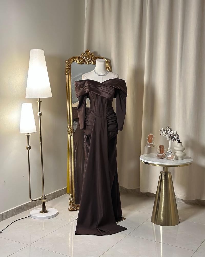 فستان سهرة فاخر بلون الشوكولا الداكن(بني)، مصمم ليبرز جمالك برقي وفخامة. يتميز الفستان بتصميم أوف شولدر جذاب يعكس أنوثة لا مثيل لها، مع قصات أنيقة تُبرز الخصر وتنسدل بانسيابية حتى الأرض. التفاصيل الجانبية المتدرجة والطيّات الناعمة تضيف لمسة ساحرة للفستان، بينما تمنحه الأكمام الطويلة مع الخطوط الراقية لمسة كلاسيكية عصرية.
