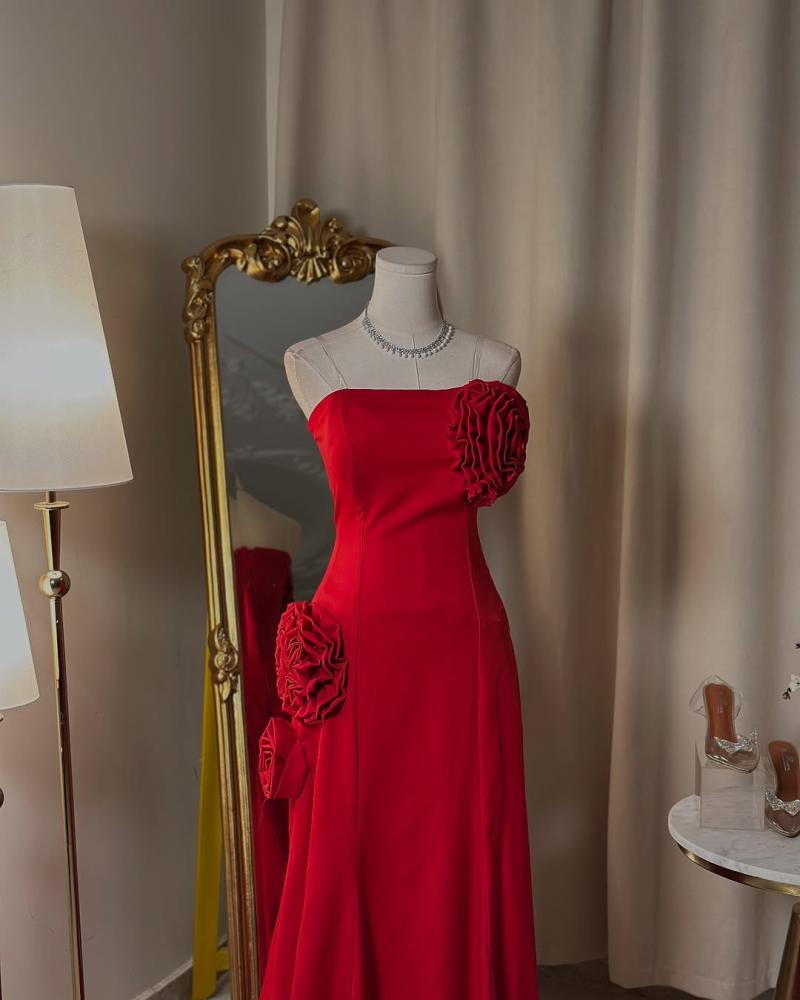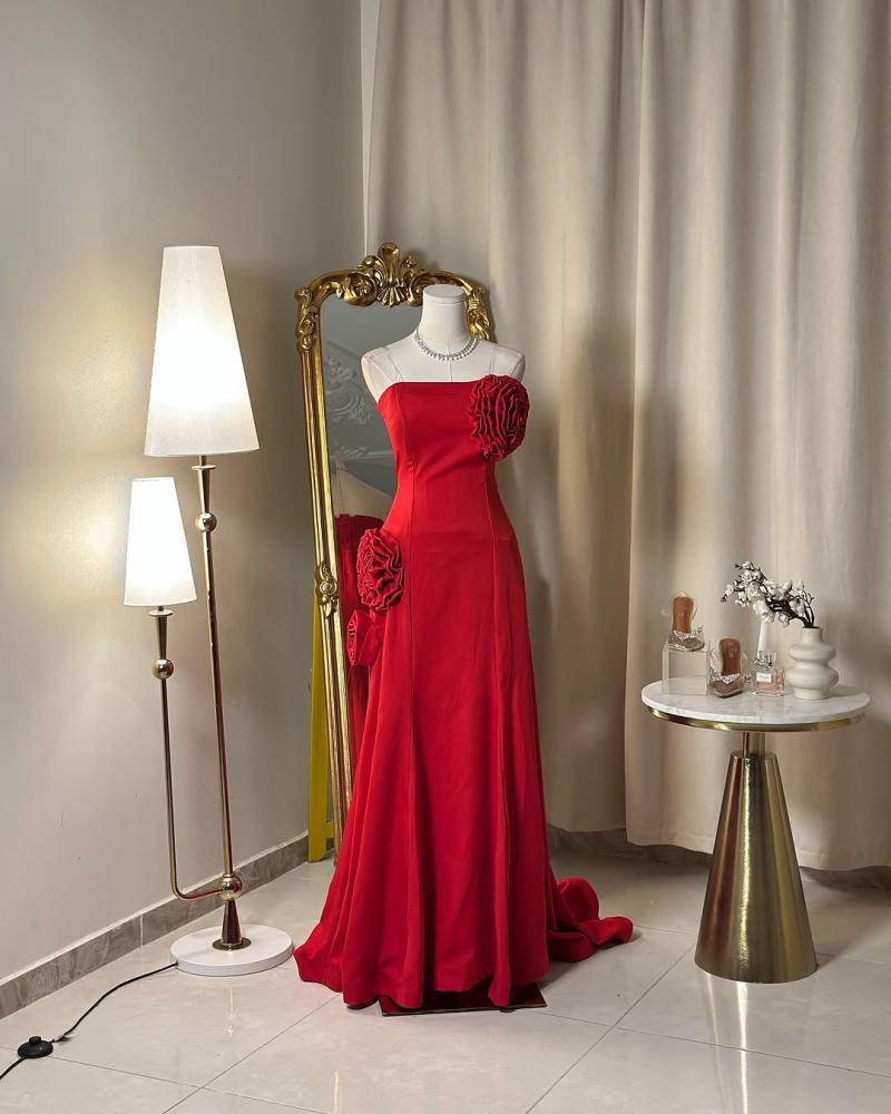 فستان سهرة أحمر فاخر، يجمع بين الأناقة والفخامة في تصميم واحد جذاب. يتميز بقصة كتف مكشوفة (Off-Shoulder) مع ورود بارزة على الصدر والخصر لإضافة لمسة راقية وأنثوية. الفستان مصمم بقماش انسيابي ناعم ينسدل على الجسم بشكل أنيق ليبرز جمال القوام. اللون الأحمر الحيوي يعطي جرأة وجاذبية، مما يجعله الاختيار المثالي للمناسبات الخاصة والحفلات الرسمية.