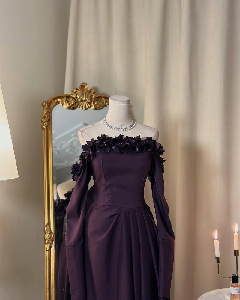 هذا الفستان يتميز بلونه البنفسجي الداكن الجذاب الذي يعكس الرقي والفخامة. تصميمه الأنيق يشمل أكتاف مكشوفة مع زينة من الورود ثلاثية الأبعاد تضيف لمسة أنثوية راقية. الأكمام الطويلة المنسدلة تعطي إطلالة ملكية متكاملة. بالإضافة إلى القصة الضيقة في منطقة الخصر التي تتسع تدريجيًا إلى الأسفل، مما يمنحك مظهرًا رائعًا ومناسبًا للمناسبات الفخمة.