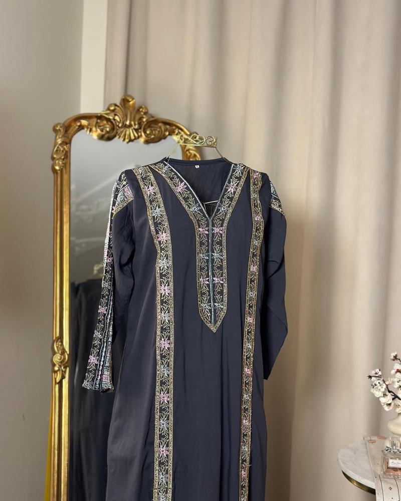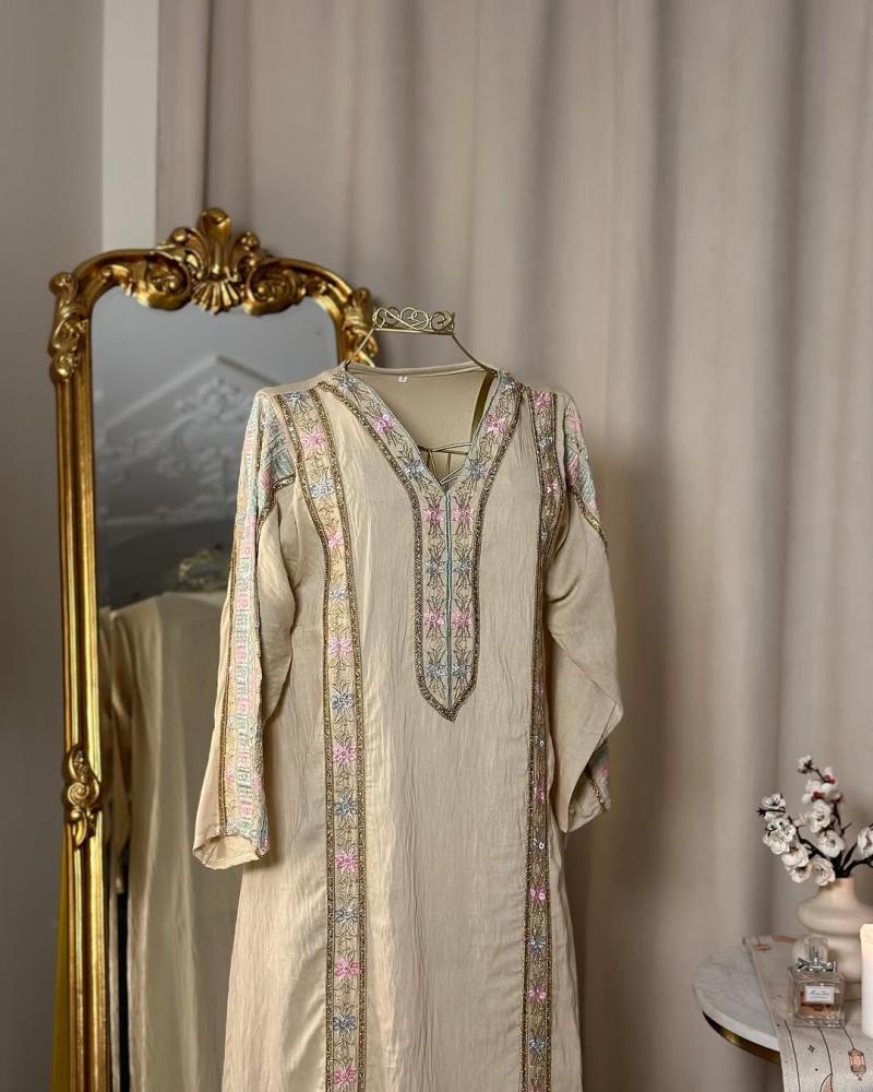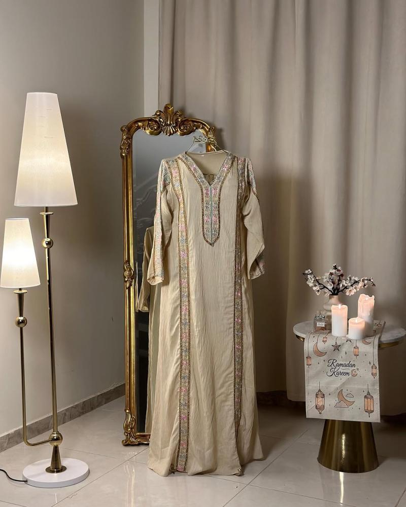جلابية فاخرة تتميز بتطريزات أنيقة على كامل التصميم. تجمع بين الراحة والفخامة بخاماتها الراقية وتفاصيلها الدقيقة التي تعزز من جمال الإطلالة. متوفرة بلونين لتتناسب مع مختلف الأذواق.