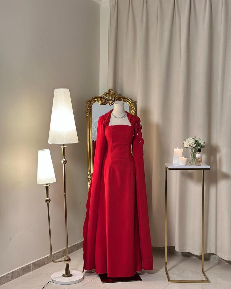 فستان سهرة أنيق يعكس الفخامة والجاذبية، يتميز بقصة كلاسيكية راقية مع ياقة مربعة وتصميم محدد للخصر، إضافة إلى كاب طويل مزين بورود جانبية لمظهر ملكي جذاب.