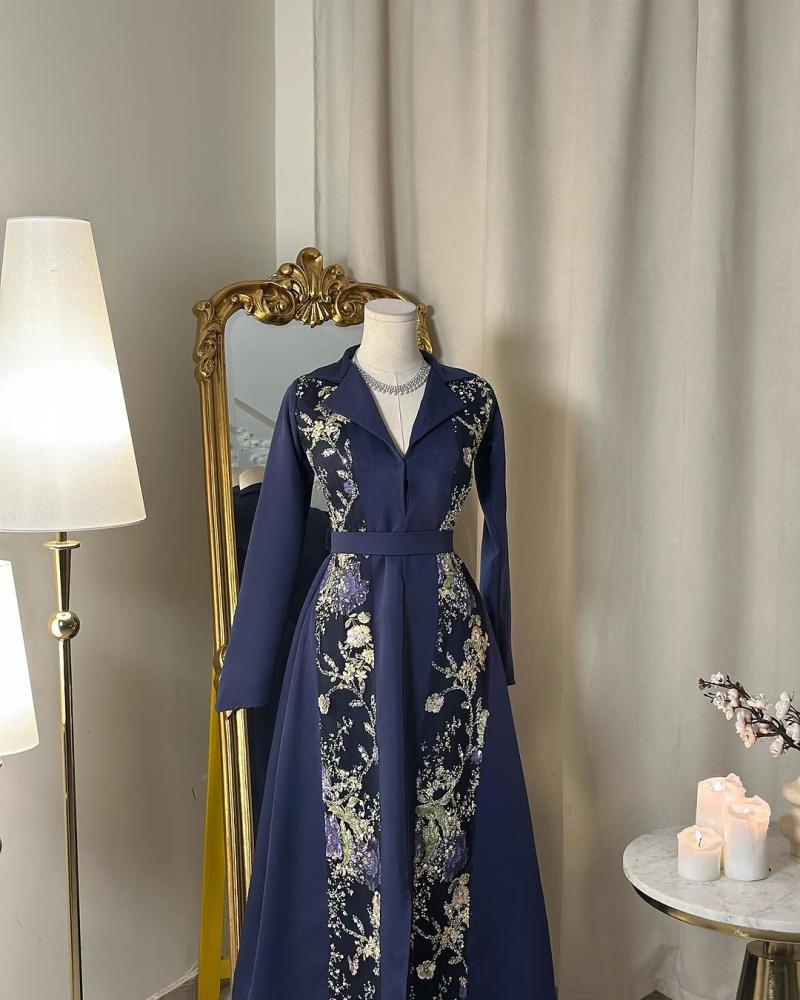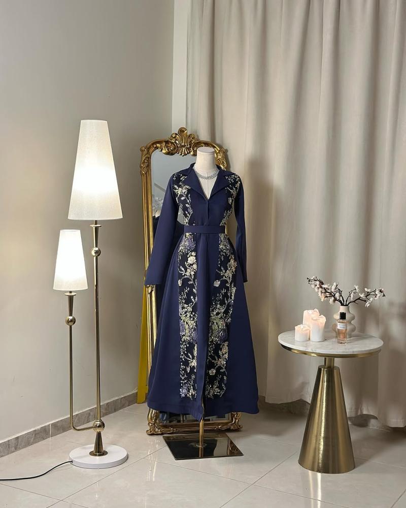 - اللون: كحلي داكن مع تطريز أنيق بألوان هادئة.