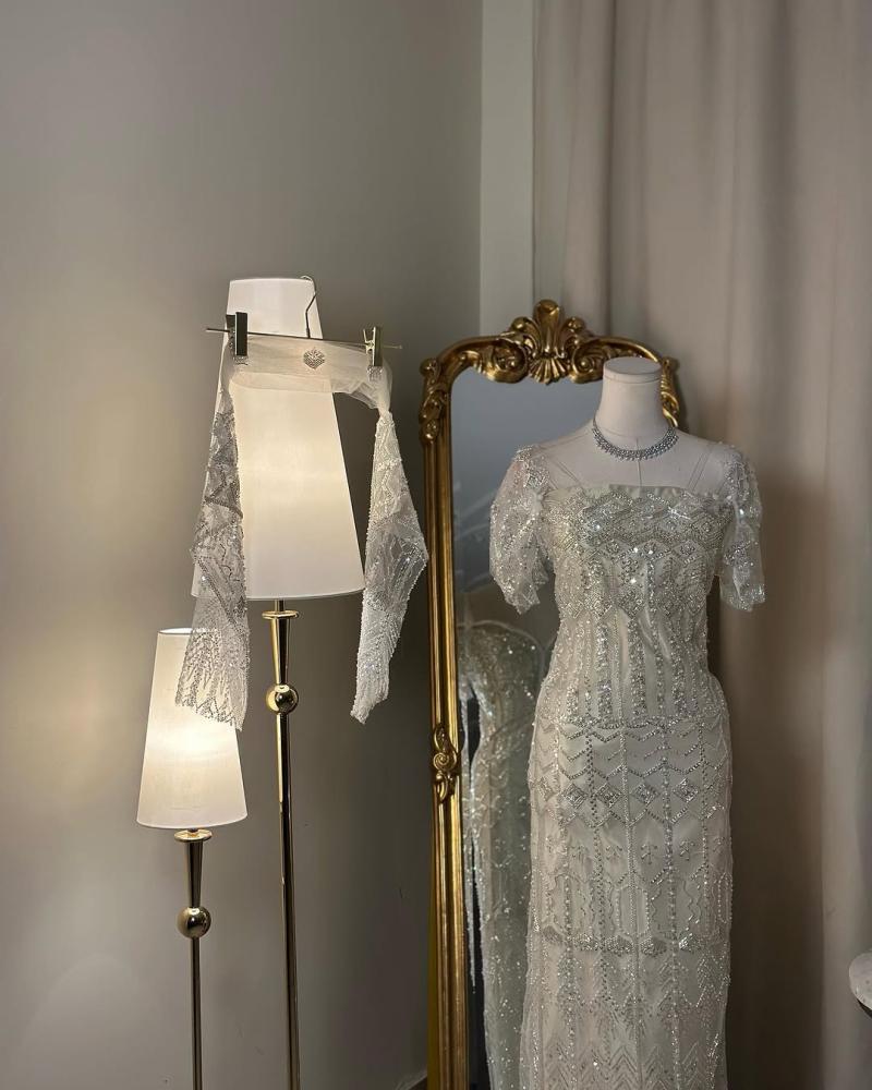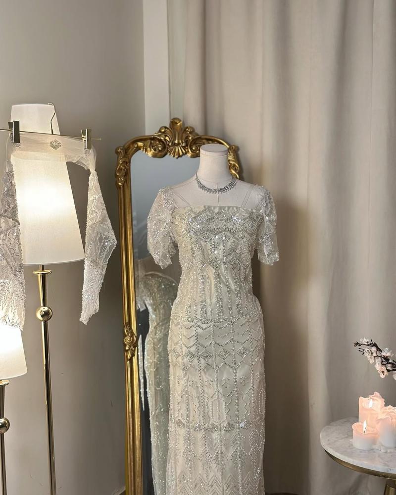 فستان ساحر بتصميم راقٍ يعكس الفخامة والرقي في كل تفصيلة. يتميز بتطريزات فاخرة تزين القماش الشفاف بطريقة أنيقة، مع أكمام قصيرة تضيف لمسة من النعومة والجاذبية. القصة الانسيابية تبرز جمال القوام بأسلوب راقٍ ومترف، مما يجعله خيارًا مثاليًا للمناسبات الفاخرة وحفلات الزفاف.