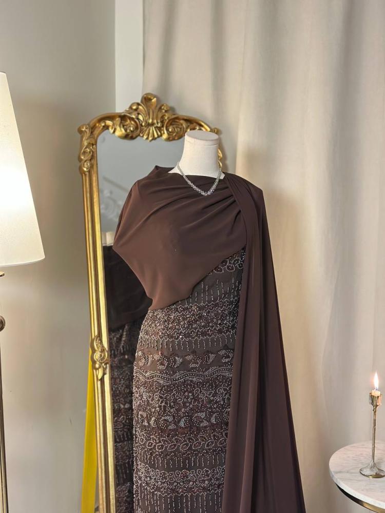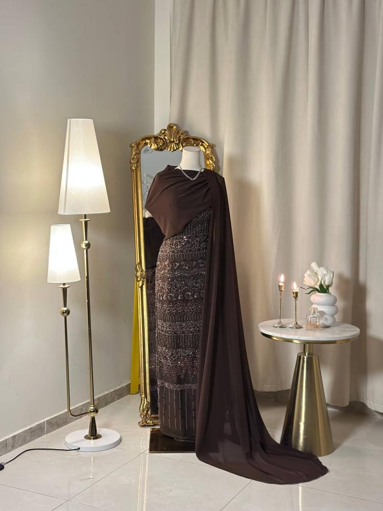 استمتعي بإطلالة تخطف الأنظار مع هذا الفستان البني الساحر، المصمم بذوق رفيع ليجمع بين الرقي والفخامة. يتميز الفستان بتطريزات لامعة غنية بالتفاصيل، مع وشاح جانبي انسيابي يضفي حركة ناعمة وفاخرة للإطلالة.