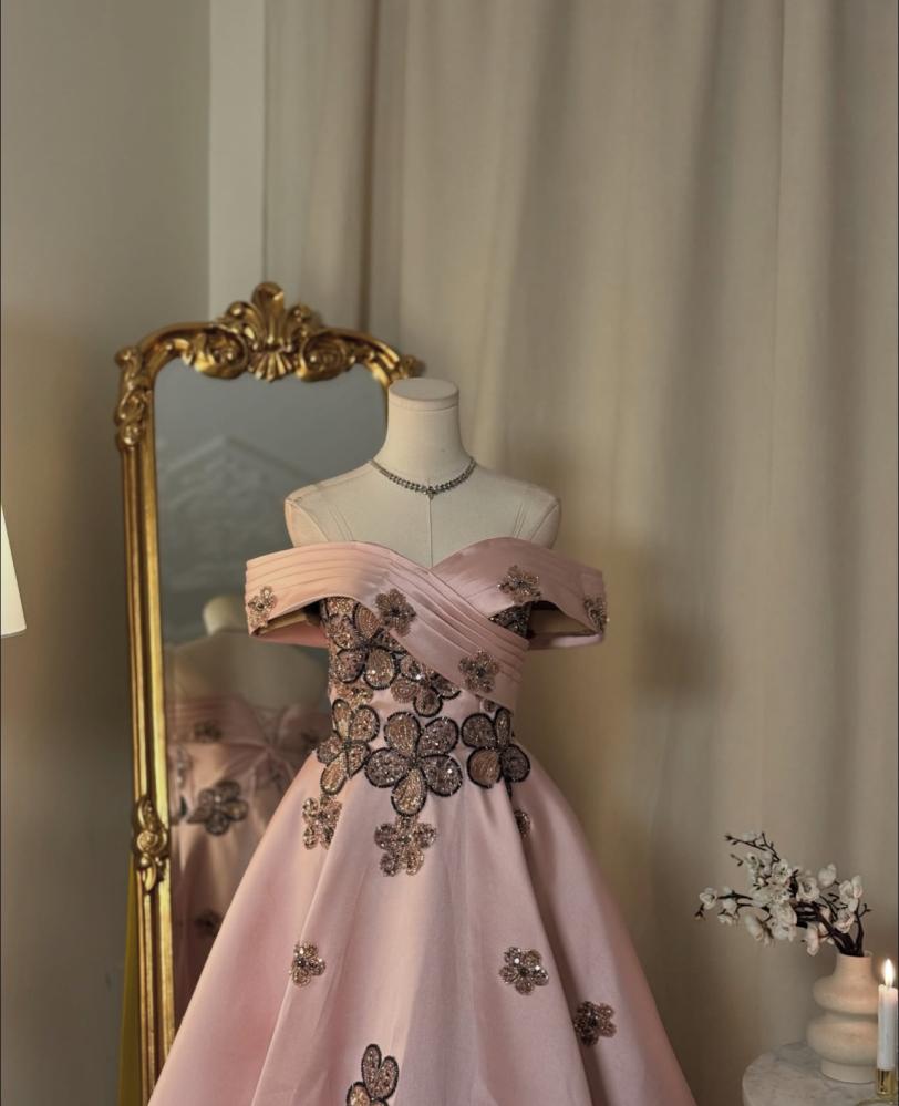 استمتعي بإطلالة فخمة ومفعمة بالأنوثة مع هذا الفستان الراقي من كولكشن فانوس. يتميز بقصة ملوكية بالأكتاف المكشوفة وتطريزات بارزة على شكل ورود لامعة تضيف لمسة أنثوية جذابة. الفستان متوفر بلونين أنيقين: السكري الناعم والوردي الحالم، ليناسب ذوقك الفريد.