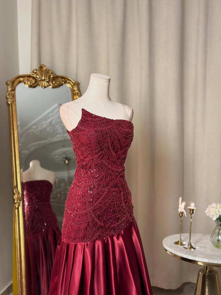 خلي كل العيون عليك مع هذا الفستان الفاخر باللون الخمري الساحر! يتميز بتصميم كتف واحد أنيق، وتطريز لامع يغطي الجزء العلوي بالكامل بأسلوب جذاب، مع تنورة من الساتان الفاخر تنسدل بانسيابية فخمة تمنحك حضور مميز في كل مناسبة.