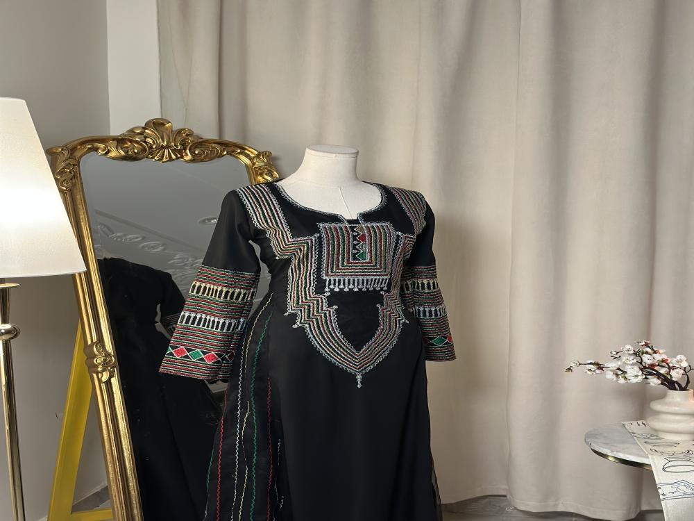 Impress everyone with a unique look with this black jalabiya that combines luxury with fine heritage details. The design features colorful embroidery covering the chest and sleeves with attractive geometric lines, reflecting the beauty of heritage in a modern way. The jalabiya is suitable for various occasions with its elegant look that gives you confidence and brilliance.