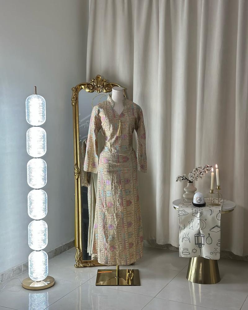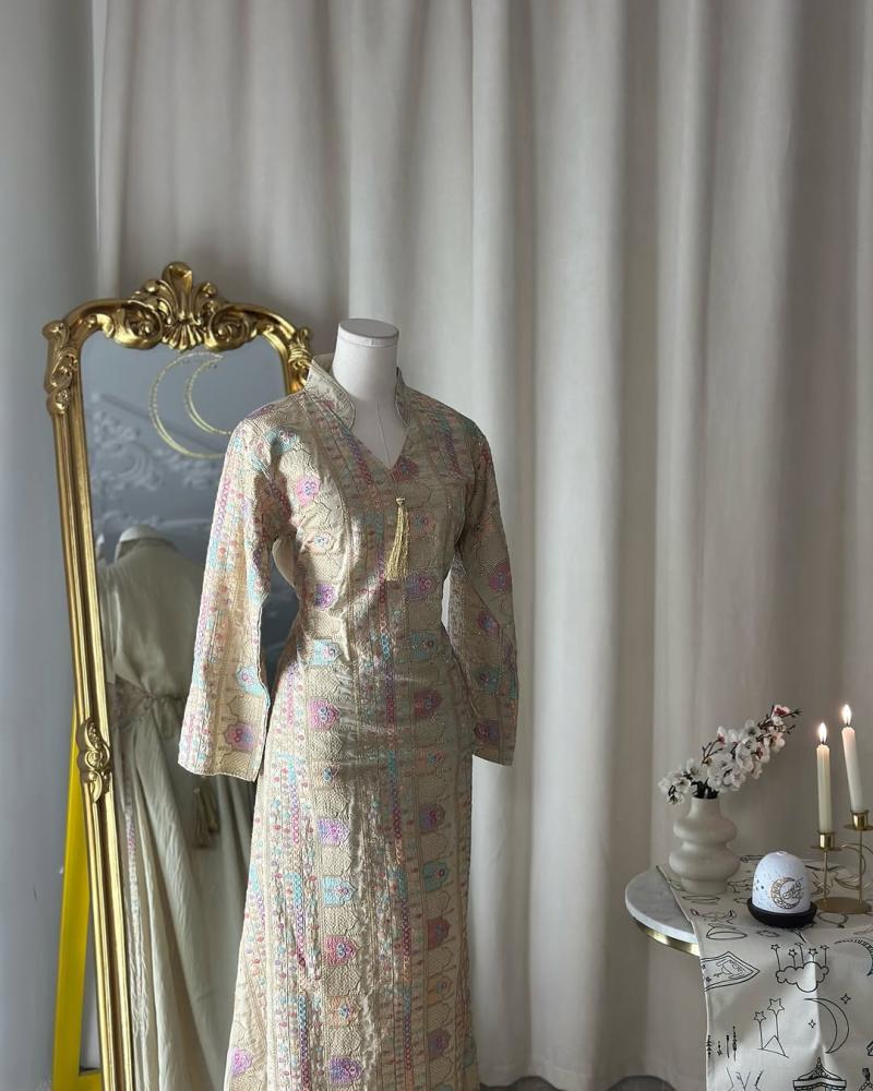 🌟 Description of the Jalabiya: Enjoy a charming look with this elegantly designed Jalabiya that combines simplicity and aesthetic details. It comes in a light beige color with calm patterns in pink and gold colors that give it a distinctive character. Its design features long sleeves and comfortable material, making it an ideal choice for Iftar and Suhoor gatherings.