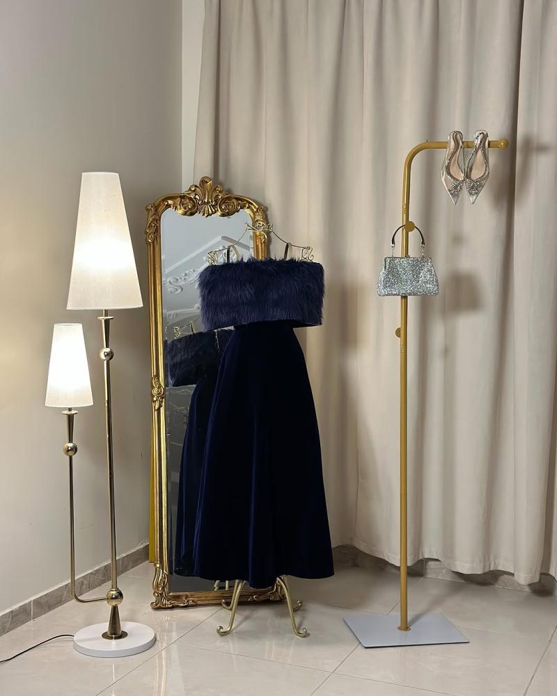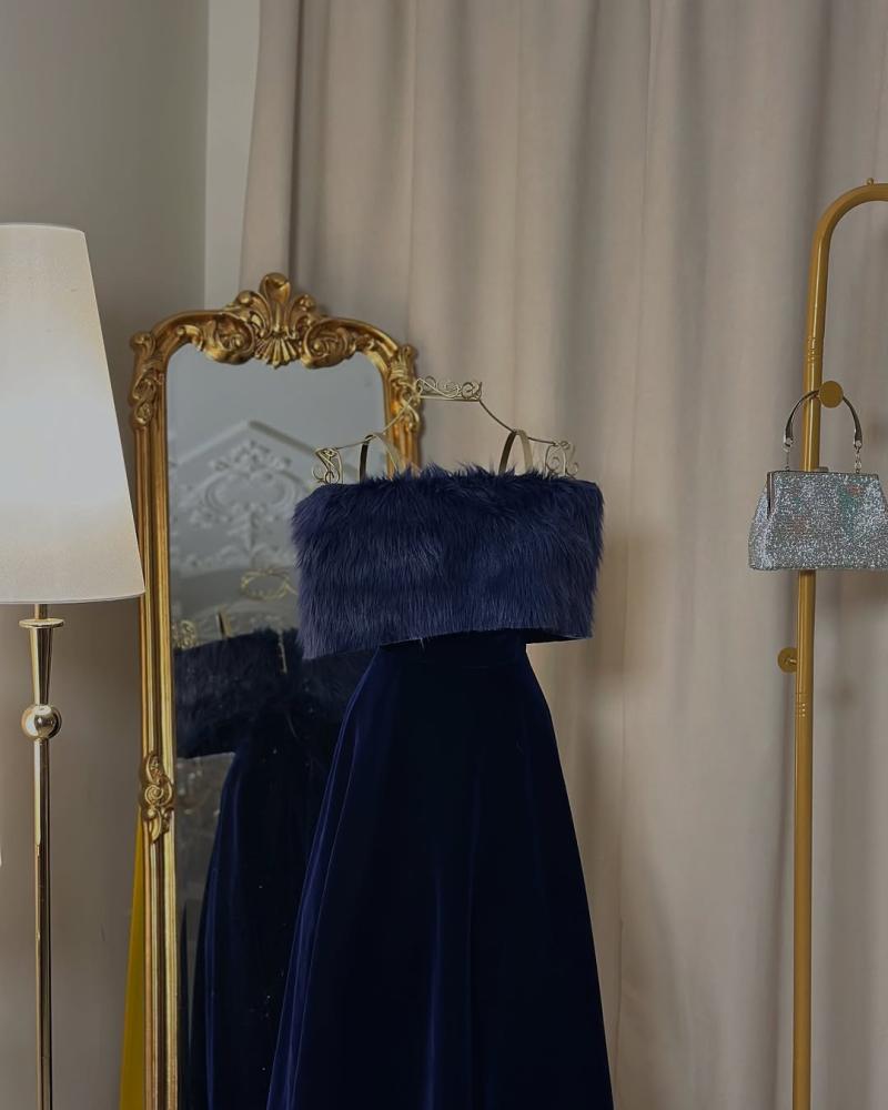 This navy blue dress features a unique and elegant cut. Made of luxurious velvet fabric that adds a touch of elegance and charm. It comes in a modern design with a soft fur top that adds a warm winter touch, while the skirt comes in a wide cut that reflects luxury and is suitable for upscale occasions.