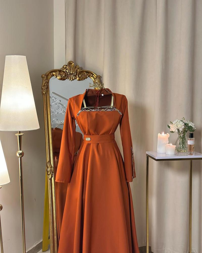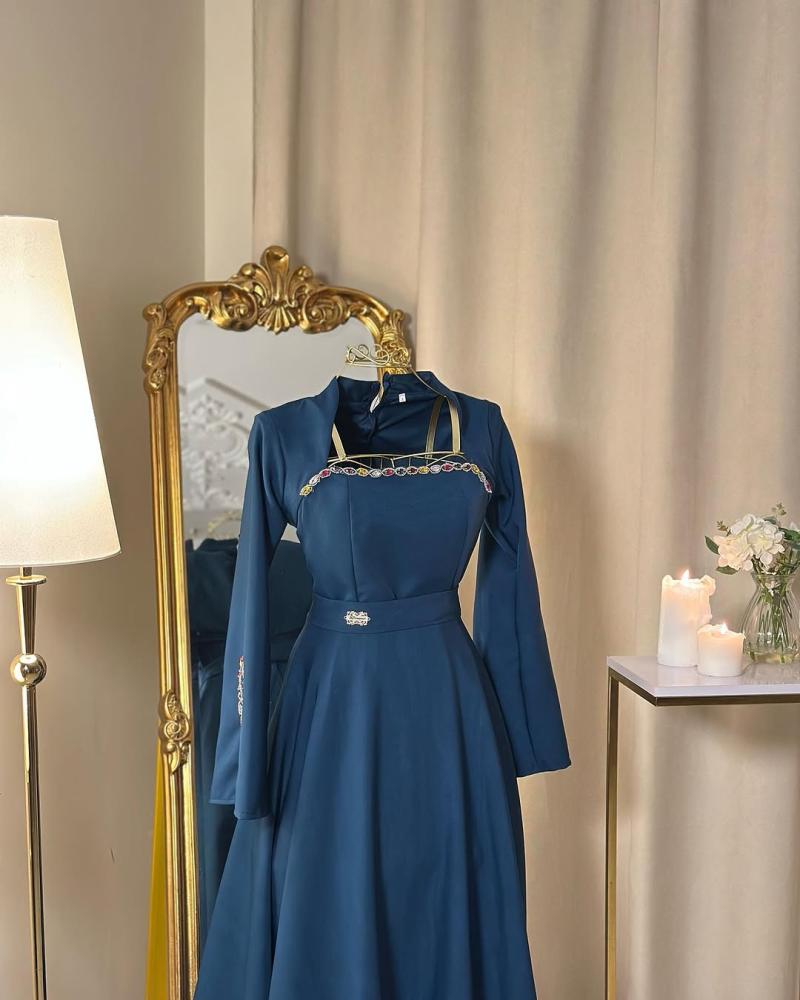 • التصميم: ياقة مرتفعة بتطريز أنيق، أكمام طويلة بتفاصيل أنيقة على المعصم، وحزام عند الخصر يبرز القوام.