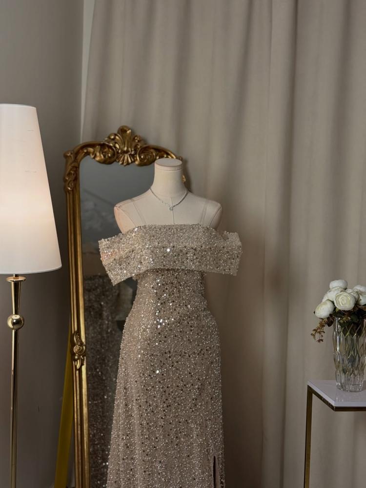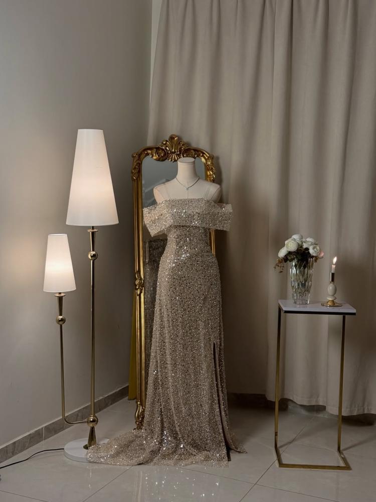 تألقي بإطلالة تخطف الأبصار مع هذا الفستان الذهبي المصمم بفخامة تجمع بين البريق والرقي. القماش بالكامل مزين بالترتر اللامع الذي يعكس الأضواء ويمنحك حضورًا ساحرًا، بينما تأتي القصة الضيقة مع فتحة ساق جانبية لإبراز أنوثتك، ويكتمل التصميم بذيل خلفي أنيق يضفي لمسة ملكية على إطلالتك. تصميم الأوف شولدر يبرز جمال الكتفين والرقبة ليمنحك مظهرًا لا يُنسى.