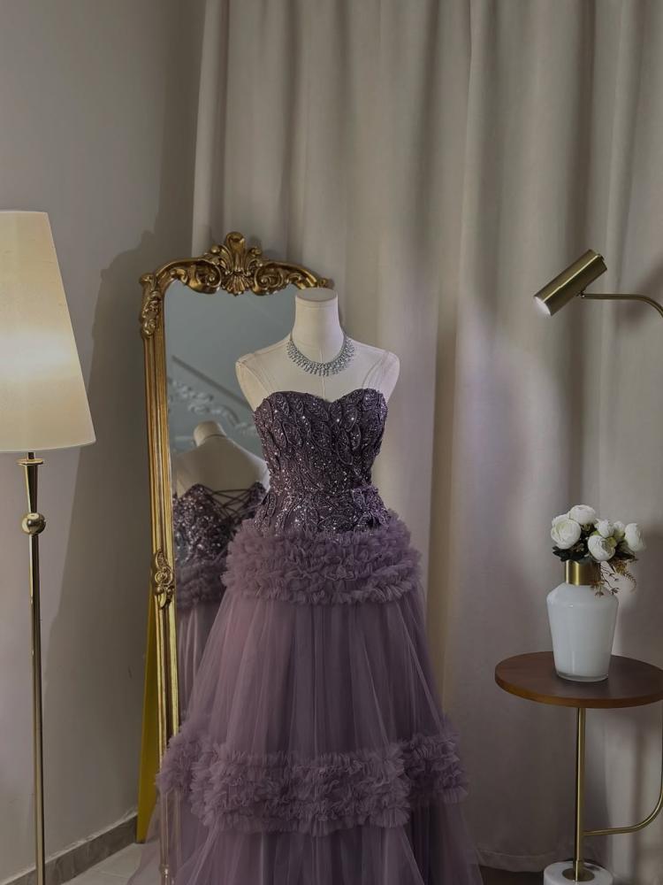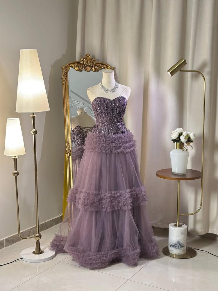 فستان ساحر بلون اللافندر الراقي، يجمع بين الرقة والفخامة في تصميم واحد يخطف الأنظار. يأتي الصدر مطرزًا بتفاصيل براقة تضيء الإطلالة، فيما تنسدل الطبقات الناعمة من التول المزدانة بالكشاكش لتمنحك حضورًا أنثويًا ملوكيًا. مثالي للمناسبات الفاخرة وحفلات المساء التي تبحثين فيها عن التميّز والجمال.