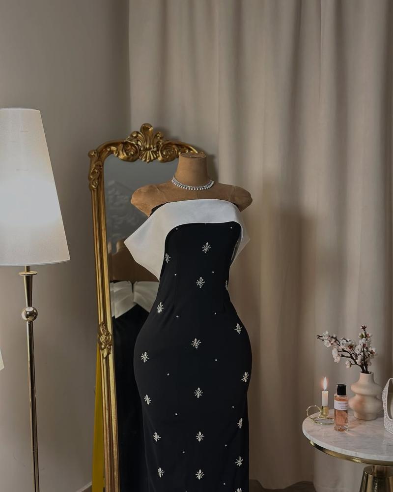 A classy black dress with an elegant design that reflects simplicity and luxury. It features touches of shiny embroidery all over the dress, giving it an attractive and charming touch. The white upper collar gives the design a modern and distinctive look. The narrow cut highlights the beauty of the body in a feminine and elegant style.