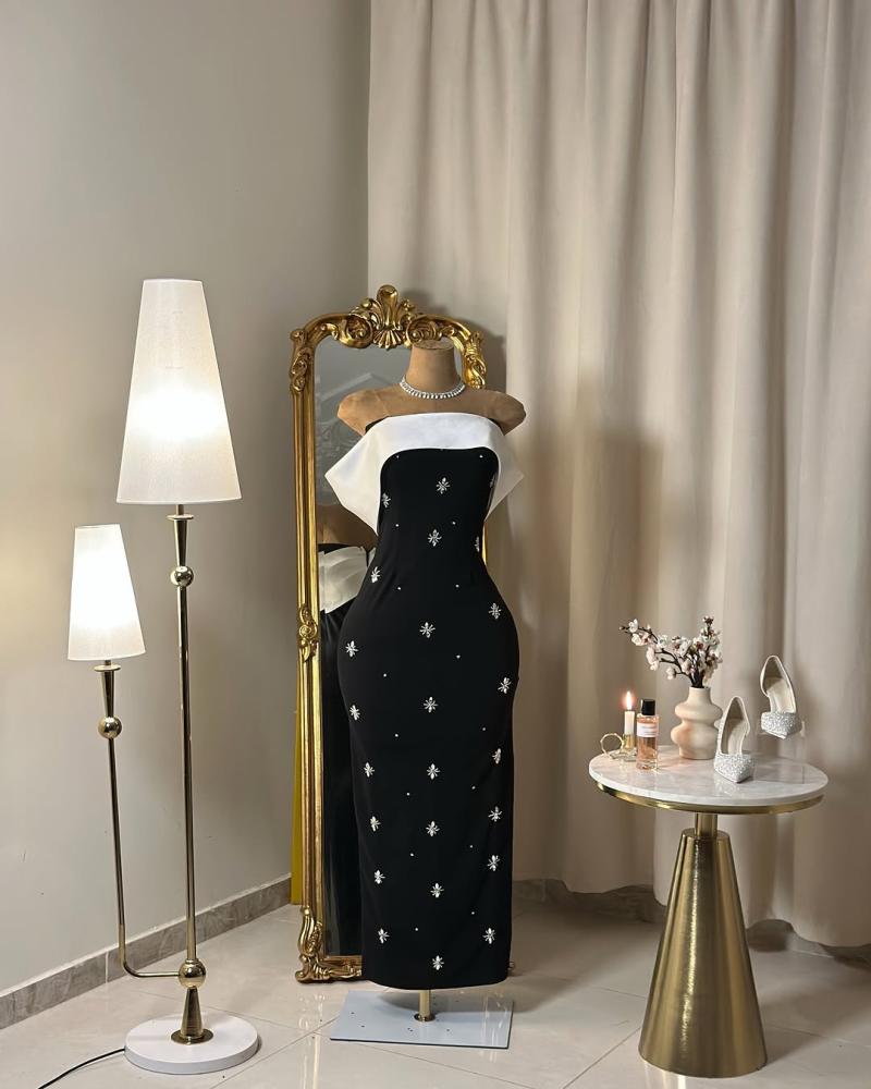 "For those looking for elegance and sophistication, this dress is your perfect choice for an eye-catching look! 🤍✨ Add it to your shopping cart now and shine with irresistible beauty!"