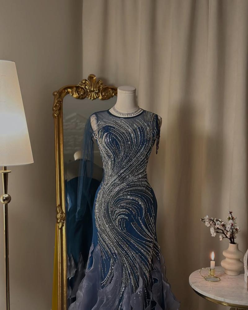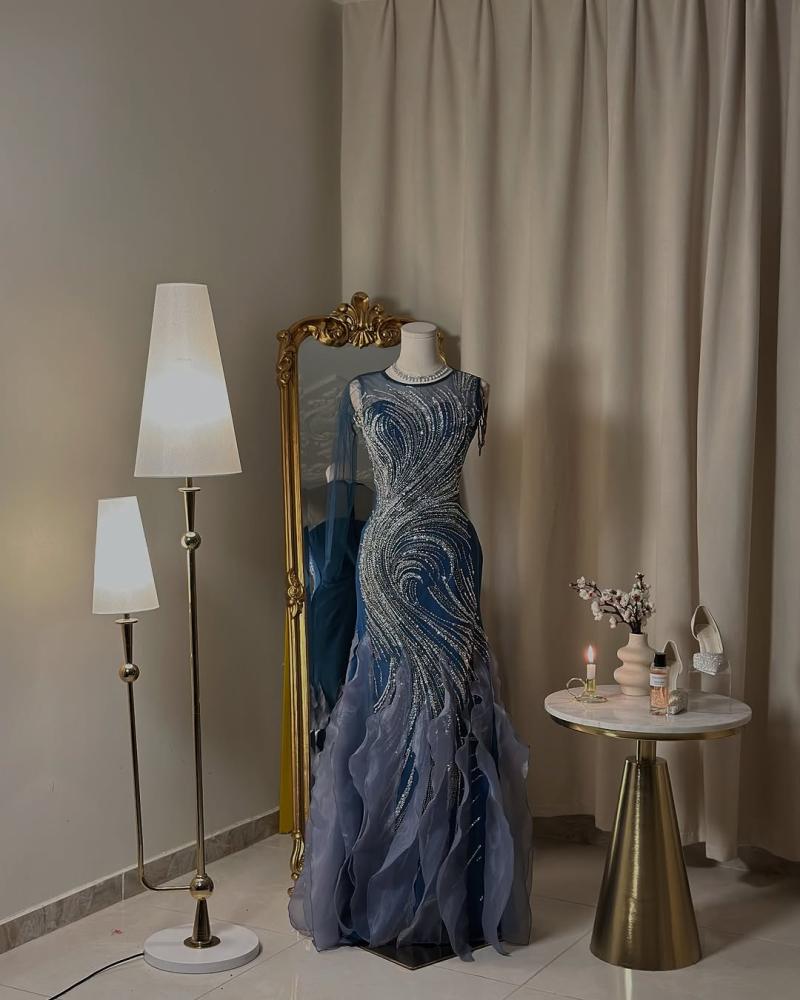 Add a touch of luxury and charm to your look with this luxurious blue dress . It features sparkling embroidery inspired by the movement of waves, designed with great precision to highlight the details of the body in a sophisticated style. The tiered skirt with transparent layers gives a dreamy flowing movement, making this dress the perfect choice for evening parties and special occasions.